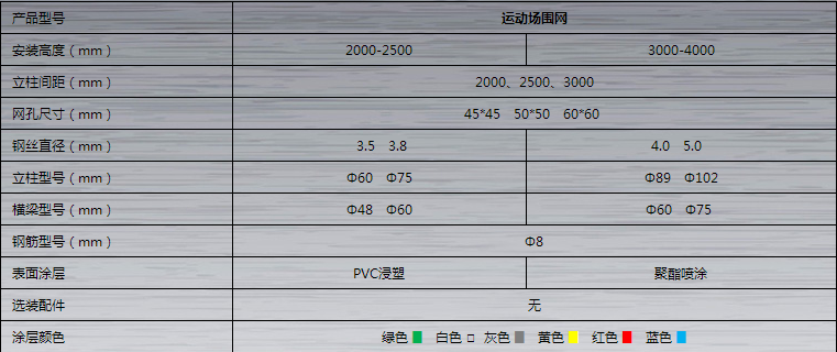 體育場(chǎng)圍網(wǎng)具有防腐、防老化、抗曬、耐候、色彩鮮亮、網(wǎng)面平整,強(qiáng)力張緊,不易受外力撞擊變形、現(xiàn)場(chǎng)施工安裝、靈活性強(qiáng)(可根據(jù)現(xiàn)場(chǎng)要求隨時(shí)調(diào)整造型和尺寸)的有點(diǎn)??蛇x顏色:藍(lán)色、綠色、黃色、白色等。