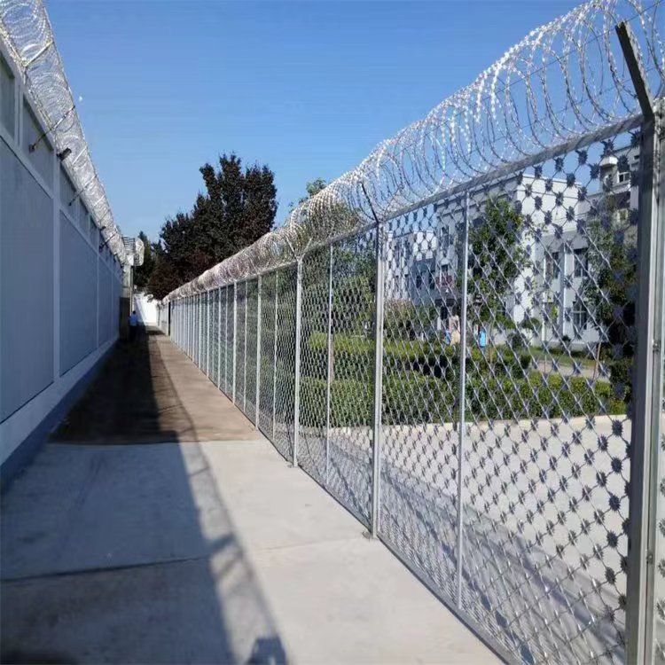 監獄隔離網是由網片、 Y型立柱和刀刺組成的,立柱與網片采用邊耳連接或防盜螺絲貫穿連接。第三種是近年來新出的梅花剌隔離網,隔離網的網片是菱形孔的美格網,在每個鋼絲相連接的焊點_上焊接梅花刺片,刺片鋒利,也就無法攀越。