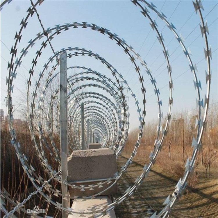 刀型刺絲是一種近年發展起來的防護、隔離能力較強的新型防護網產品。刀刺網它采用鋼板沖壓成型包附于熱鍍鋅鋼絲(筋絲)之上,由銳利尖角鍍鋅鋼板或不銹鋼薄板做刀片,高張力鋼絲做芯線組合而成的。鋒利的刀型刺由雙線扣裝后成蛇腹狀,既美觀又讓人不寒而栗。起到了很好的阻嚇作用。邊境鐵絲網以刺絲滾籠采用刀片刺繩繞圈后相臨兩圈每隔120°用刺絲連接卡固定,張開后形成蛇腹網狀,閉合后刀片刺繩圈徑為50c,