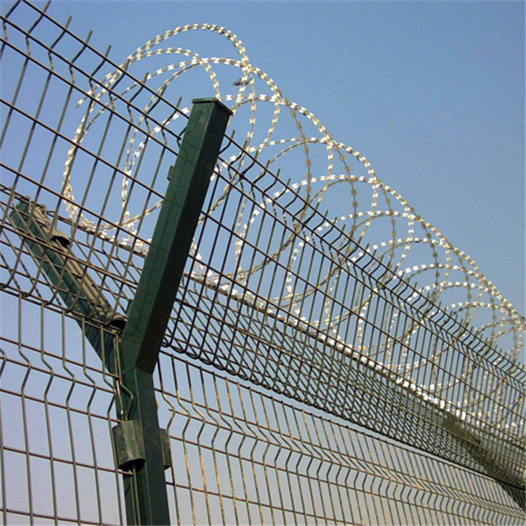監獄鋼網墻又稱作“Y型安全防御護網”,是由V型支架立柱,加強型焊接片網,安全防盜連接件和熱鍍鋅刀片刺籠組成強度和安全防御性級別很高。近年來,被廣泛應用在監獄,軍事基地等高安全場所。在監獄鋼網墻頂部加裝刀片刺絲、刀片刺繩后又很好的增強了安全防護性能。采用電鍍、熱鍍、噴塑、浸塑等防腐形式,具有很好的抗老化、抗曬、耐候等特點。其產品造型美觀、花色多樣,既起到防護作用,又起到美化作用。由于具有安全性高、防攀爬能力好,網片連接方式采用特制SBS緊扣件,有效防止人為的破壞性拆卸,橫向四道折彎加強筋,使網面強度顯著增加。
