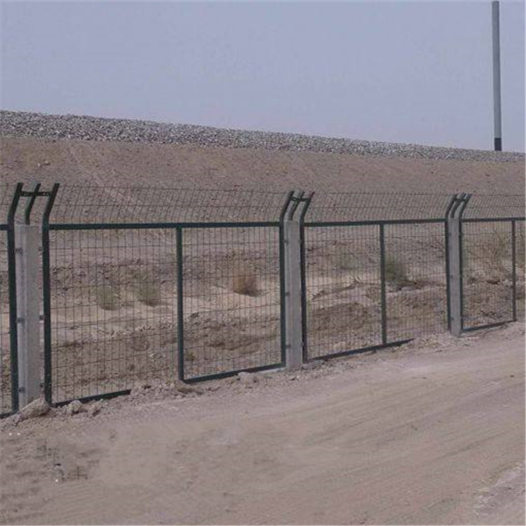 鐵路防護柵欄又稱鐵路隔離柵是用于鐵路兩側的隔離防護設施起隔離和防護作用的護欄網產品,應用于高速公路、鐵路、高鐵、大型場地安全防護用。采用高強度低碳鋼絲、鋁鎂合金絲,或鍍鋅絲編織焊接而成,具有組裝靈活、結實耐用的特點,既可以制作成護欄網墻使用,也可以用做臨時隔離網,在使用中只需采用不同的立柱固定方式便可安裝(立柱還包括水泥柱子),產品防腐 防曬 防水表面處理有、電鍍、熱鍍、噴塑、浸塑的方式。鐵路護欄在國內許多高鐵、高速公路 等道路兩側大量使用。產品表面顏色為墨綠色和草綠色,鍍層厚度為0.5~0.6mm,鍍粉采用抗老化性能的進口耐候性樹脂粉料,表面光滑。鐵路防護柵欄邊框有角鐵或者鋼管兩種焊接方式