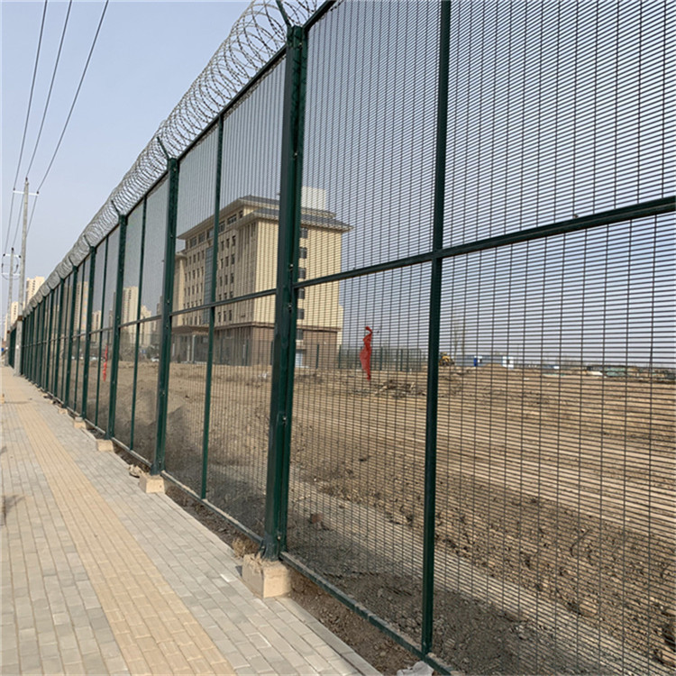監(jiān)獄鋼網(wǎng)墻又稱作"Y型安全防御護(hù)網(wǎng)”,是由V型支 架立柱加強(qiáng)型焊接片網(wǎng),安全防盜連接件和熱鍍鋅刀片刺籠組成強(qiáng)度和安全