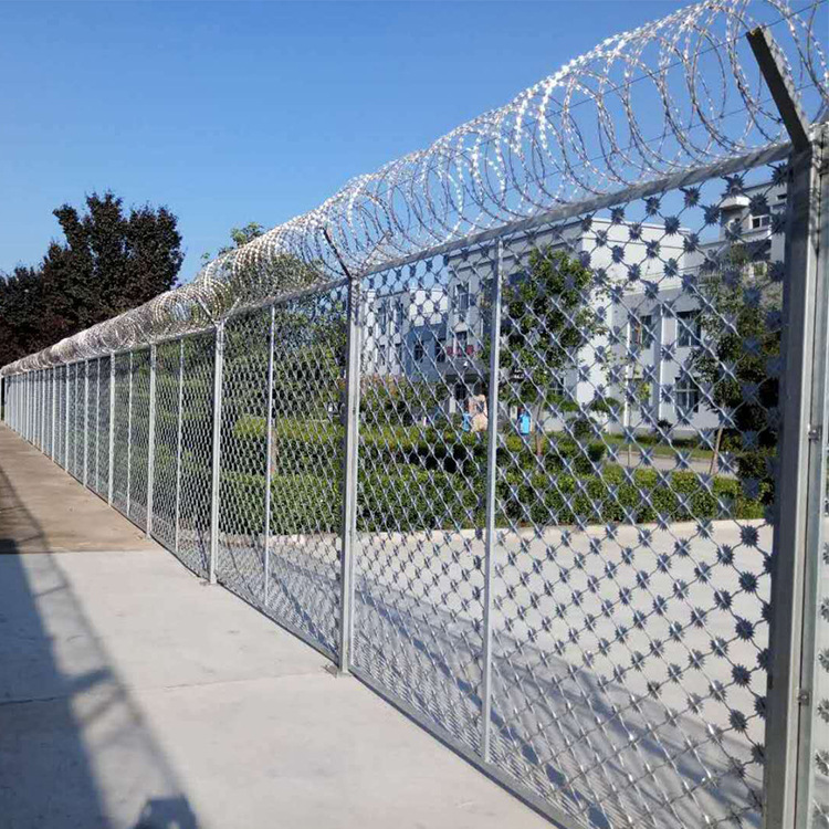 立柱的頂部多數(shù)會焊接V型支架(這種立柱也叫做Y型立柱),支架上安裝V型網(wǎng),再在頂部架設(shè)蛇腹型刀刺網(wǎng),與下方的監(jiān)獄隔離網(wǎng)完美結(jié)合,形成一道難以逾越的銅墻鐵壁。頂部的V型網(wǎng)也可以替換成拉絲,安裝簡便快捷,同時能夠節(jié)約成本。立柱頂部的V型支架兩個側(cè)臂焊接有專用的刺網(wǎng)鉤,每一-側(cè)架2道鋼絲,形成一個V型槽,然后把刀刺網(wǎng)架到上面,并根據(jù)要求的拉伸間距拉開,再用專門的不銹鋼卡扣把鋼絲和刀刺網(wǎng)卡在一起,這樣就完成了整個監(jiān)獄隔離網(wǎng)的安裝。