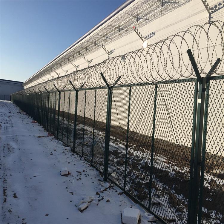 看守所隔離網又稱監獄護欄網或刀片刺網,主要是采用高強度的刀片刺網與普通防護網的結合,由V型支架立柱,加強型焊接片網,安全防盜連接件和刀片剌網組成。刀片刺網是一種新型防護網,由銳利尖角鍍鋅鋼板或不銹鋼薄板做刀片,鋼絲做芯線組合而成的防護器材。